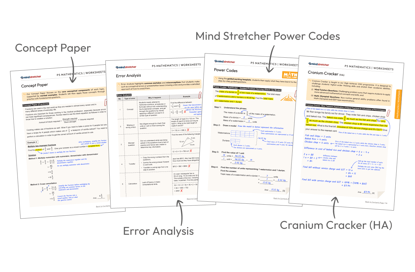 We know that problem sums are challenging for students. Our Mind Stretcher Power Codes are designed to help students identify question types easily and solve them efficiently and accurately, in a structured step-by-step approach.